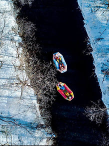 Drift along snow-covered riverbanks, with trees sparkling in rime ice.